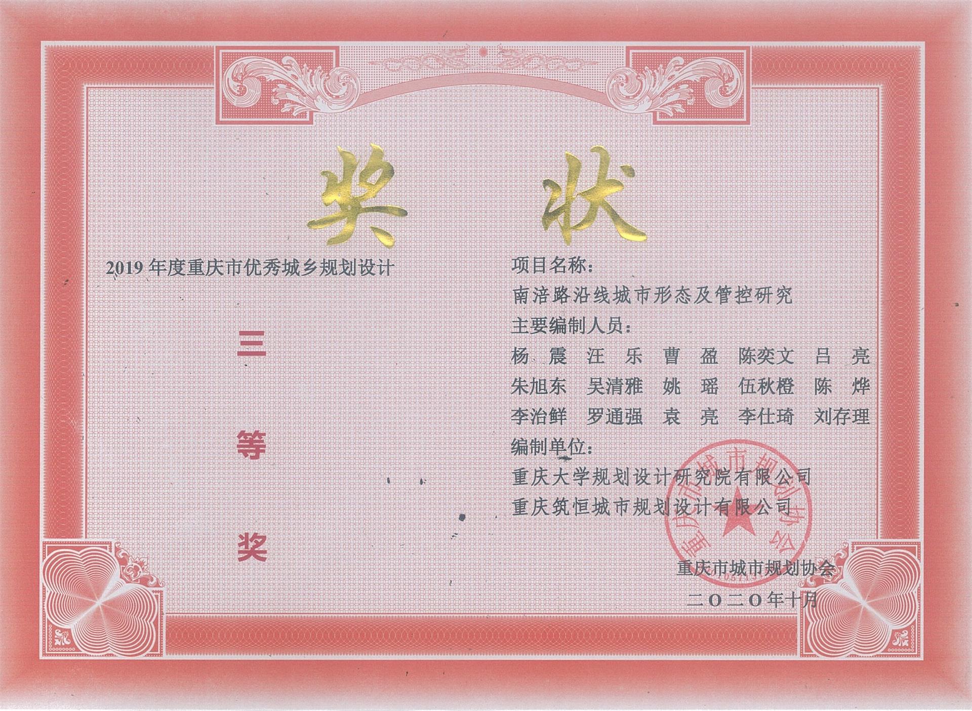 In the 2019 Chongqing Excellent Urban-Rural Planning and Design awards, two projects from our company won honors. Among them, the "Urban Design for the Core Area of Dengying District, Qijiang," designed jointly by our company and General Research Institute of Architecture & Planning Design Co., Ltd, Chongqing University, won the Second-class Award. The "Urban Form and Control Study for Nanfu Road Corridor" won the Third-class Award.